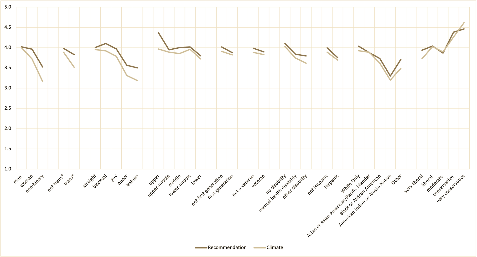 Recommendations and keywords are captured in our infographic. It is worth focusing, then, on the questions of climate and mental health. First, the mean rating for program climate is 3.9 out of 5 or "satisfied," but lower for most underrepresented groups (a previous survey found this to be true for questions on diversity and inclusion). The chart below shows both recommendation and climate ratings for various forms of identity. Interestingly, unlike other forms of underrepresentation, underrepresented political affiliation (i.e. conservative or very conservative) does not correspond with lower climate ratings. Although I did not test this difference for significance, this apparent difference could be because the climate is better for conservative students, because conservative students tend to rate things highly, or because these responses don't reflect conservative students' true views on the matter.