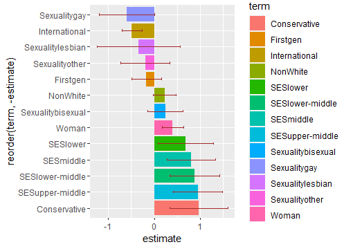 These proportions have not been tested for statistical significance against other datasets, including census values and past surveys, but readers are welcome to do so with the knowledge that around 1,000 participants answered each of these questions. Neelum Maqsood tested a subset of these demographic variables (gender, sexual identity, international status, socioeconomic status, education level, race, and politics) against chances of obtaining a permanent academic job using a regression and found that international students are less likely to obtain permanent academic jobs (5% significance level; odds are 0.6 that of local students), a new finding for APDA that will need to be explored further. Below is a chart she developed with the model estimates, but note that only "international" and "woman" (10% significance level; see this paper for context and on why this is likely a recent phenomenon) are significant results.