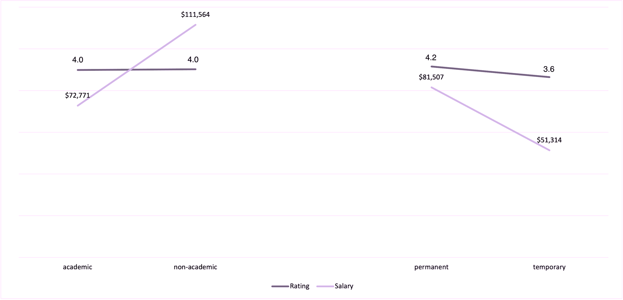 Note that while satisfaction in academic and non-academic jobs is about the same (but higher for permanent than for temporary academic jobs), the salaries for those in non-academic jobs are much higher, which has been reported in previous surveys.