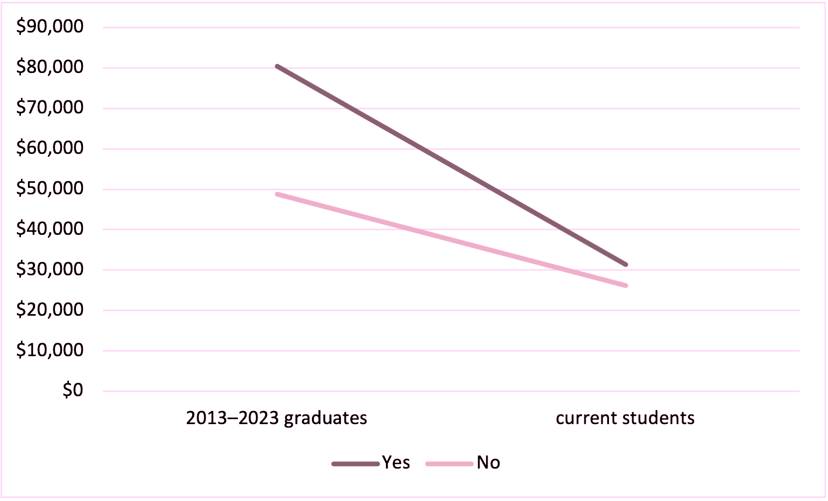 On these questions, note that whether participants said they could obtain $1,000 for emergency purposes depended on their employment type and graduation year. For instance, graduates who said they could not obtain these funds had a mean salary of $48,809, which is higher than the mean for all current students, including those who said they could obtain such funds. This difference could be due to the addition of dependents over time, independent sources of wealth, or subjective influences.