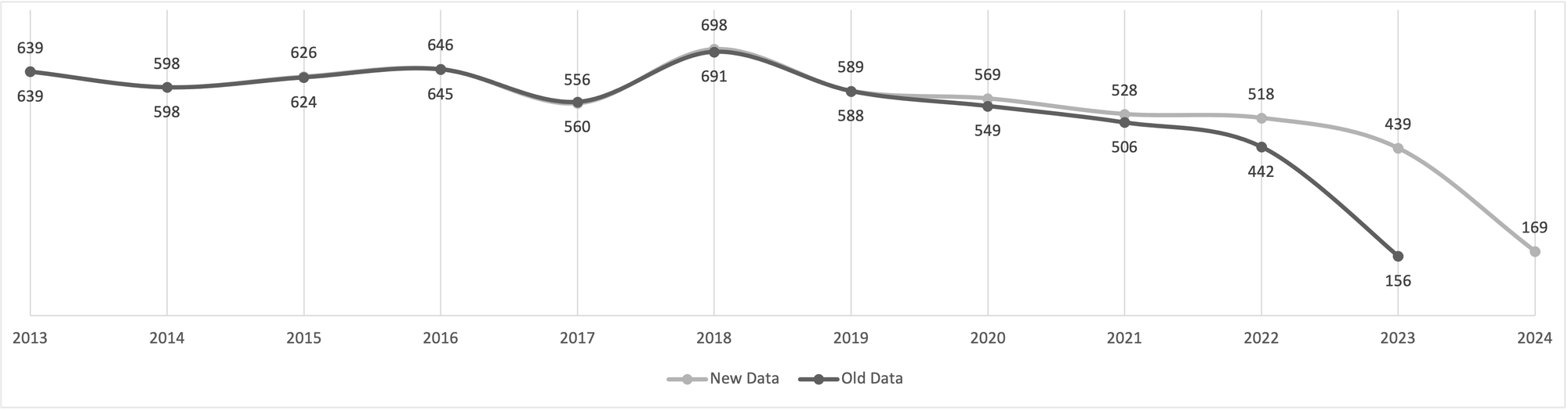 Over the spring and summer we updated the database using placement pages and other public sources of data (h/t Ricardo Rodriguez), inviting program representatives to edit their dashboards at the end of the summer. This effort led to 406 new graduates in the covered period (2013–2023), over 2/3 of which are from 2023. We have updated the interactive graphic on the homepage with this data, and you can explore individual program data through the website (e.g. ASU). Below is a chart comparing new and old data.