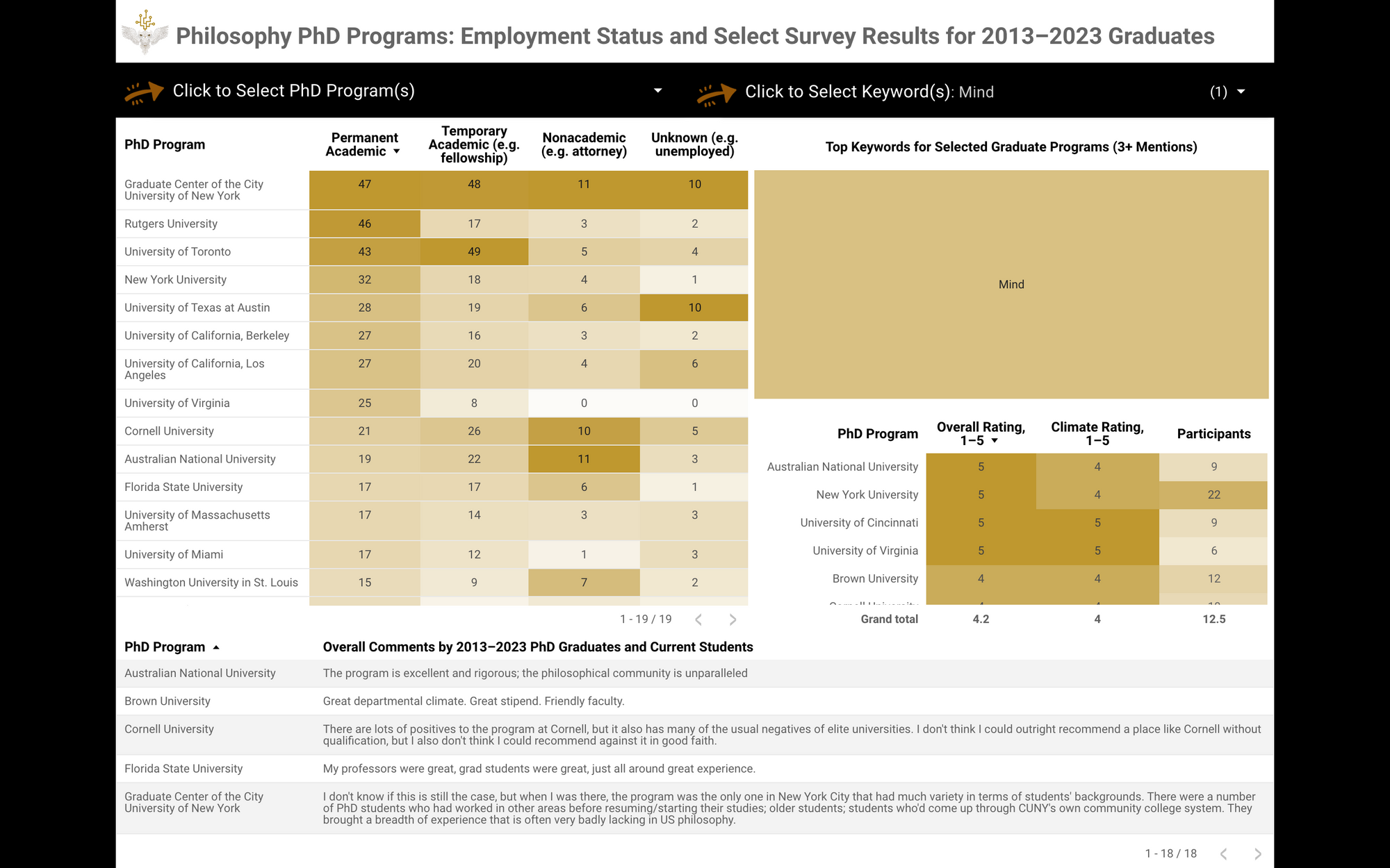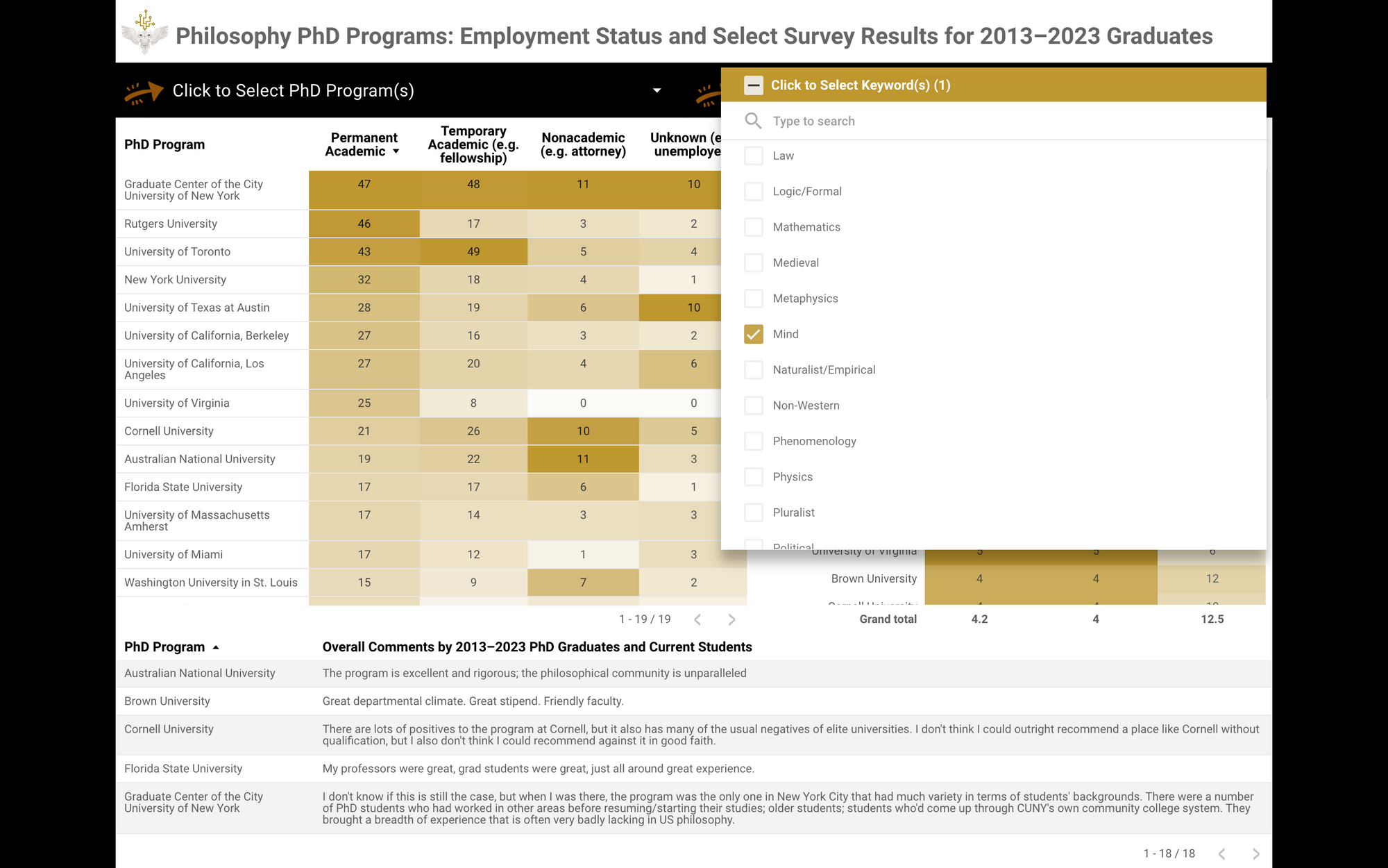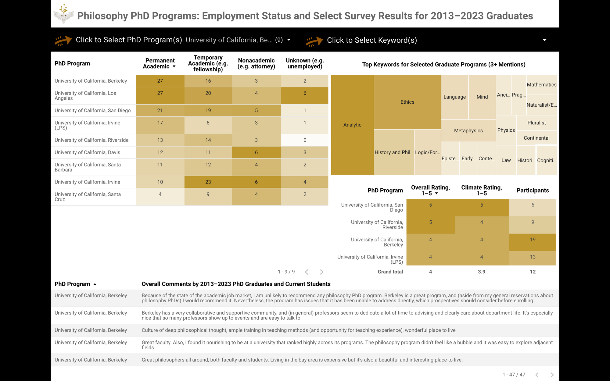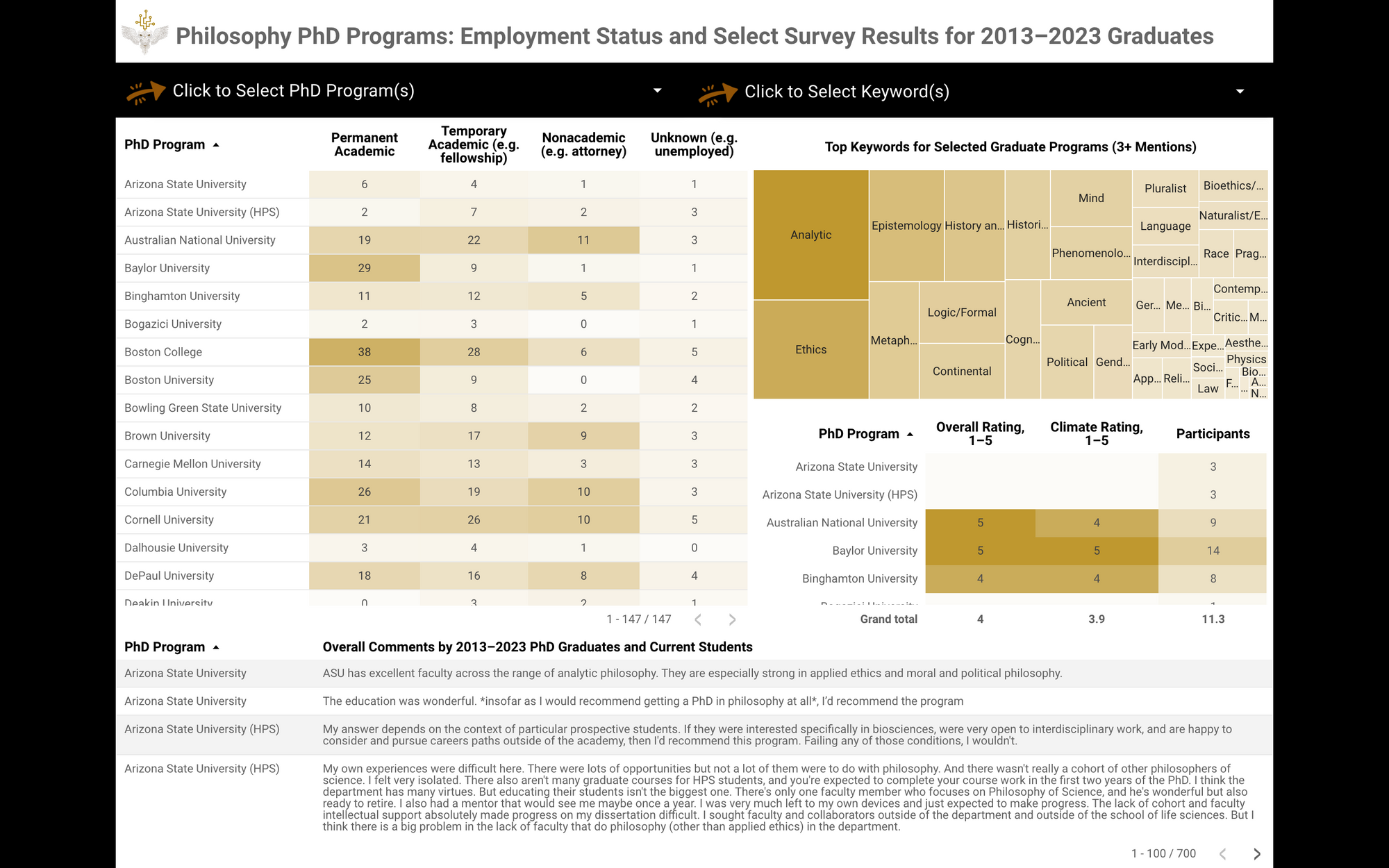 Between February and August of this year the APDA project has been busy collecting and checking data on the employment status of recent graduates from nearly 150 philosophy PhD programs. Three people were especially key to this effort: Alisha Nesslage, now a graduate student at UC Irvine, Ricardo Rodriguez, a computer science major at UC Merced, and Aarynn DeLeon, a philosophy major at UC Merced. In parallel to these efforts we rolled out a new survey, with the help of Neelum Maqsood; we hope to release a research report with the full results of that survey in the coming months. To help capture these efforts, we now have a new data dashboard which will soon launch to the homepage: